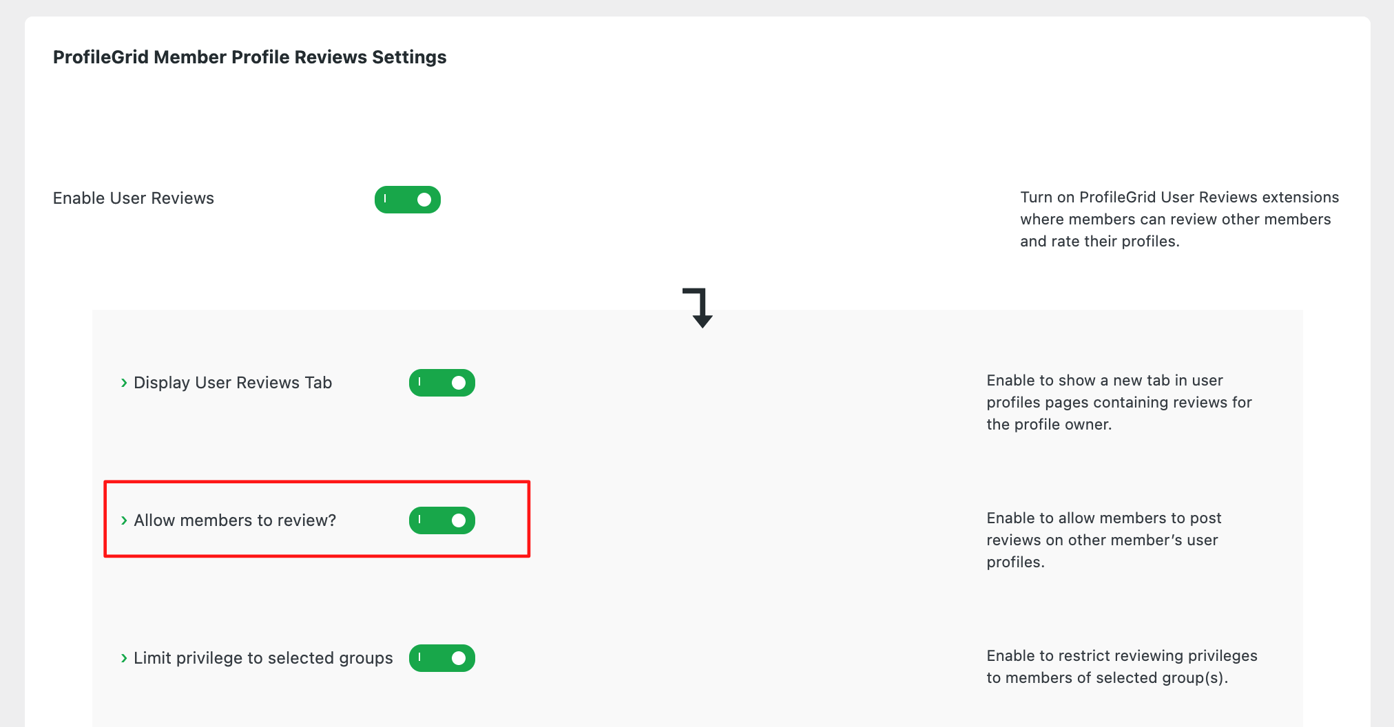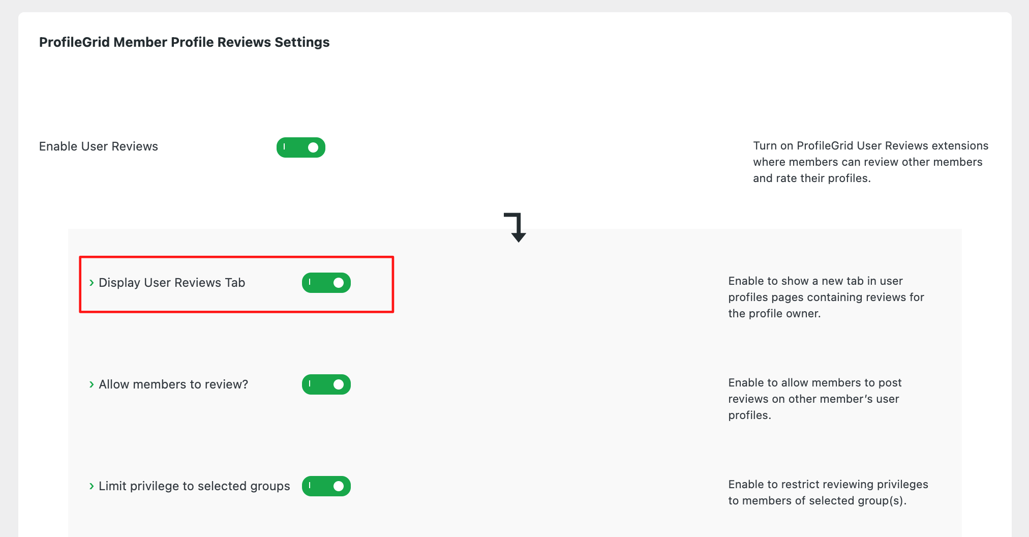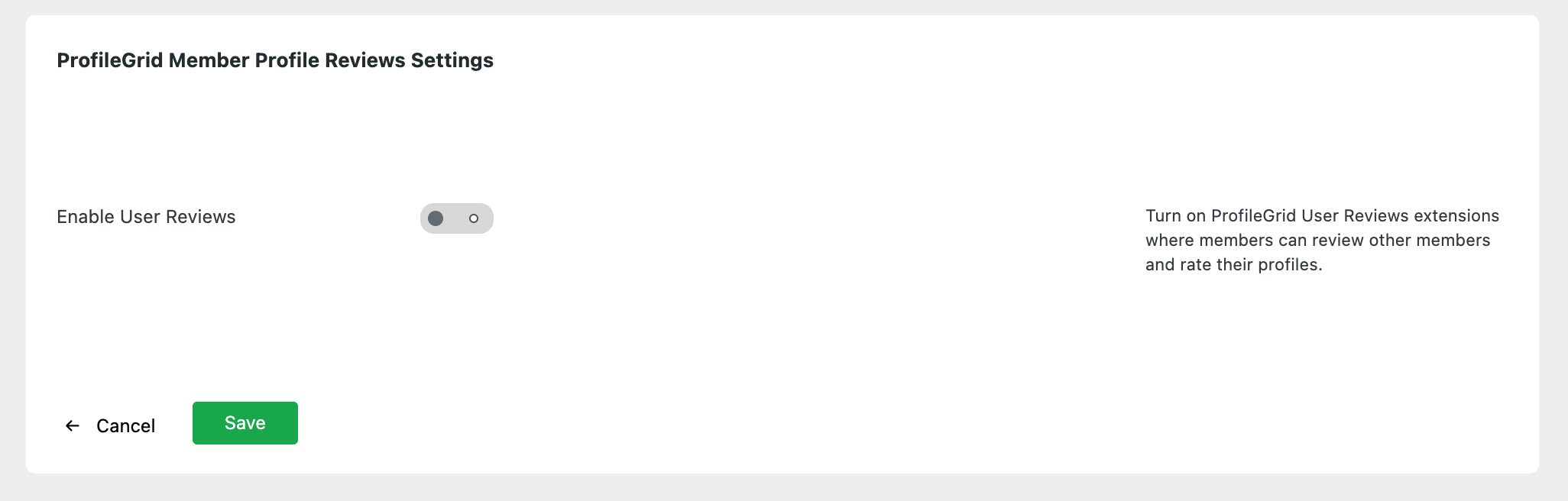 Step 1: Turn on the “Enable User Reviews” toggle to turn on ProfileGrid User Reviews extension settings where members can review other members and rate their profiles.