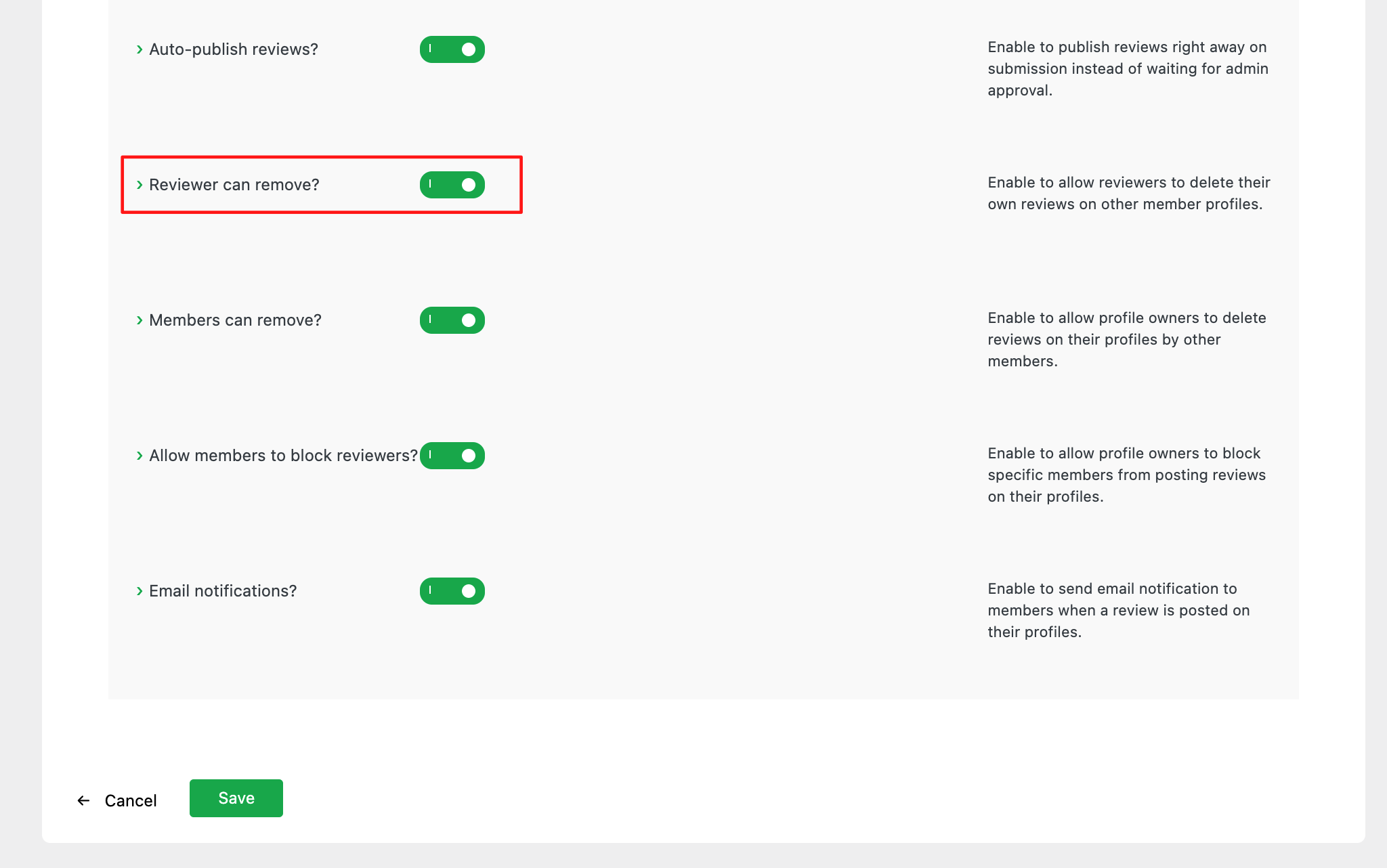 Step 6: Enable the “Reviewers can remove?” toggle to allow reviewers to delete their own reviews on other member profiles