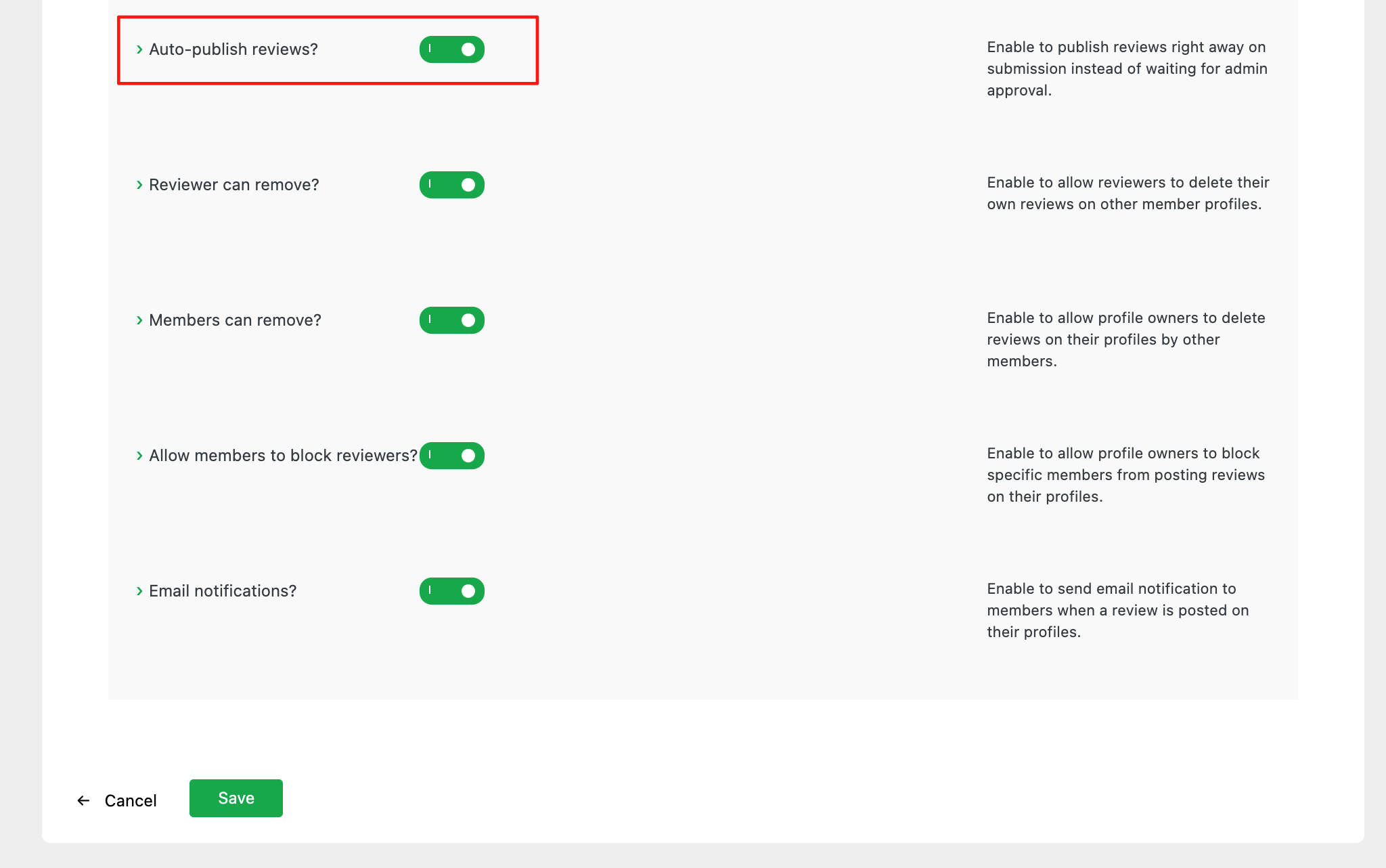 Step 5: Enable the “Auto-publish reviews?” toggle to publish reviews right away on submission instead of waiting for admin approval.