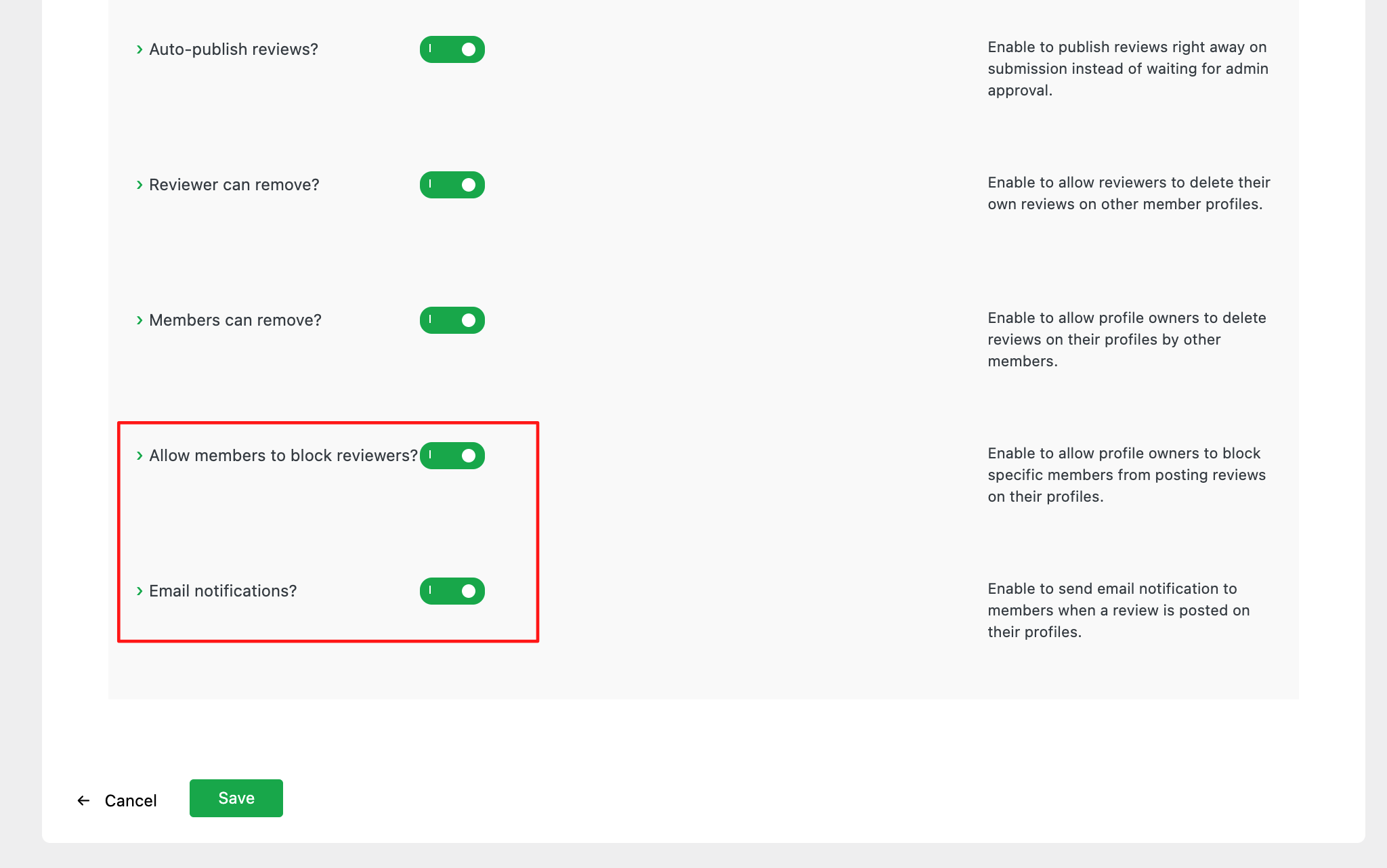 Step 8: Enable the “Allow members to block reviewers?” toggle button to allow profile owners to block specific members from posting reviews on their profiles.