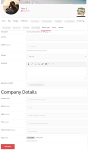 We see a tab of the same name ‘Submit Jobs’ has appeared in the user profile. Its inside content shows a complete form. This predefined form is made for registered users who can list new job openings from the frontend. This form is a default one created by the Job Manager plugin itself.