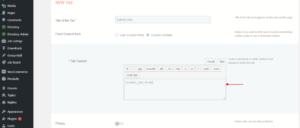 Now, let us go on and test the other shortcode [submit_job_form] in a similar manner. So now we will create a tab and name it “Submit Jobs”. In the Custom Content text area, we will apply the above-mentioned shortcode. Then let’s see what happens after we click the ‘Save’ button.