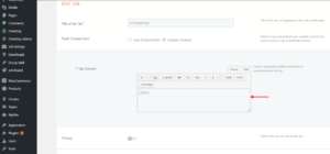 Now, once you start editing this tab, you will get two options – ‘User Custom Post’ and ‘Custom Content’. On clicking the custom content option, a text area will appear where we will have to apply the shortcode.