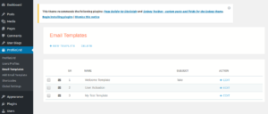 Email Templates is listed as third sub-menu option under “Profile Grid” on the left hand-side admin dashboard menu. The corresponding page allows for viewing, addition, deletion, or editing of templates, that can be applied for outgoing emails from ProfileGrid.