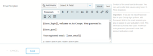 EMAIL TEMPLATE: This is the template for email sent to the user. You can use following placeholders for from ProfileGRID repository that will be replaced by actual user’s data at time of mail initiation: