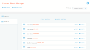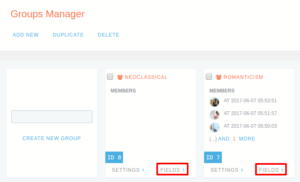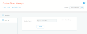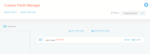 Custom Fields Manager offers two main options in operation bar: NEW FIELD and NEW SECTION. Also, there is a filter to chose from the available Groups to which section and its fields will be associated.