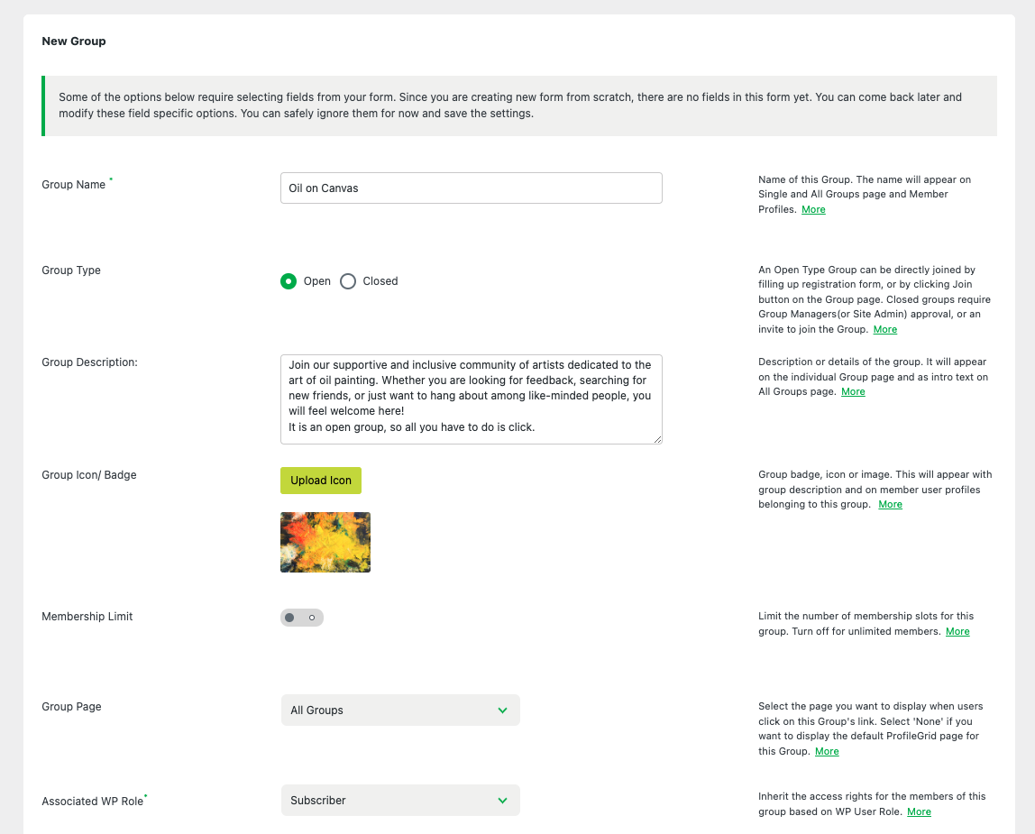 Group Icon/ Badge: Group badge, icon, or image. This will appear with group description and on member user profiles belonging to this group.