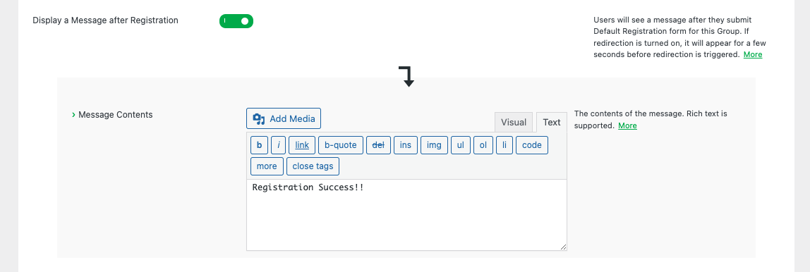 Display a Message after Registration: This message will appear to the user after the form is submitted. If redirection is turned on, it will appear for a few seconds before redirection is triggered.
