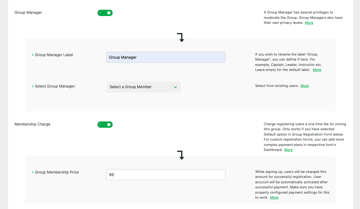 Membership Charge: Specifies whether current group being created is open for free registrations or will there be any required charges.
