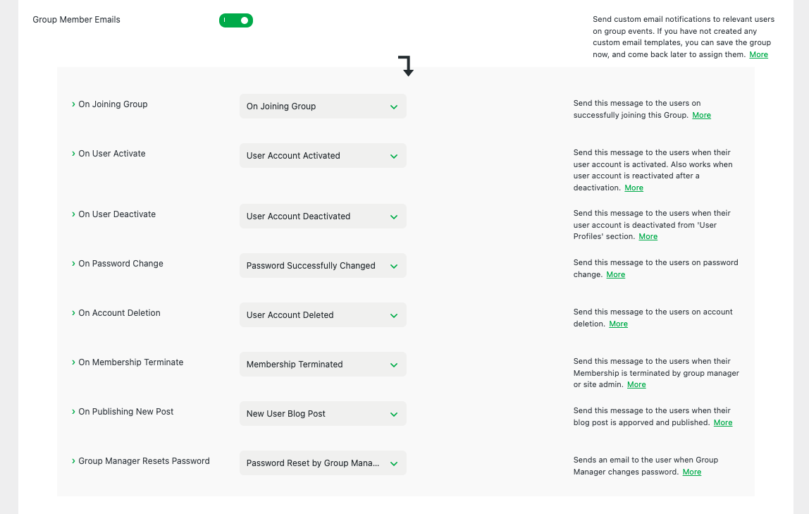 Member Email Notifications: Send relevant custom email notifications to the user on important registration events. If you have not created any custom email templates, you can save the group now, and come back later to assign them.