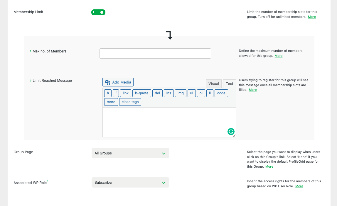 Limit Reached Message: Available only if “Membership Limit” option is selected. Users trying to register for this group will see this message once all membership slots are filled.
