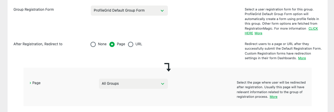 Group Page: Select the page you want to display when users click on this Group’s link. Select ‘None’ if you want to display the default ProfileGrid page for this Group.