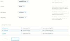 CSV MAPPING SCHEME:Allows for the mapping of all the other fields (apart from above two mandatory ones) from CSV file to the Group. CSV file will be parsed and all the available columns will be automatically listed here in separate rows with following to options to choose from: