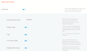 Default Blog post Status: Here you can specify the default status of the blog once it has been submitted. It can be: pending, published, or draft. Published allows it to be automatically approved and Pending requires admin moderation.
