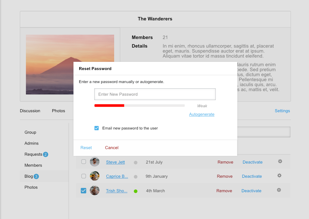 Offer more power and control to your Group Managers. They can edit Groups, approve membership requests, moderate blogs, manage users, etc. from a dedicated frontend Group management area.