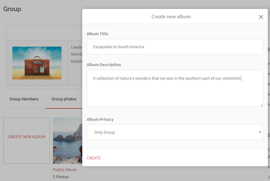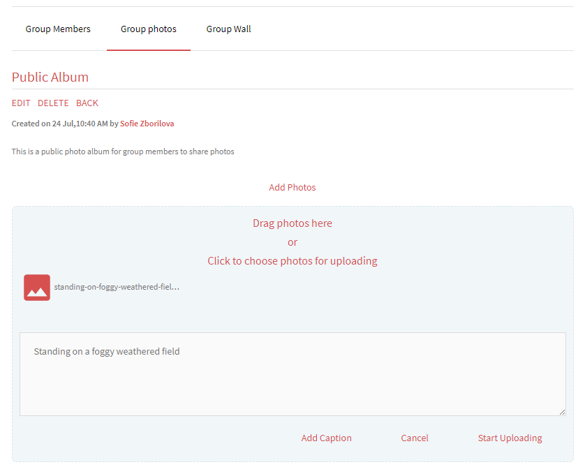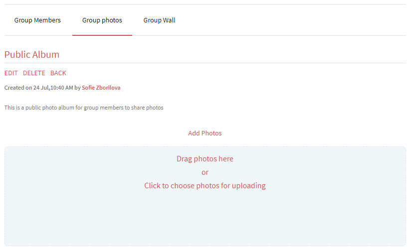 Allow your users to create and share Photo Albums within their Groups. There's also an option for public photos. Users can enlarge and comment on different photos.