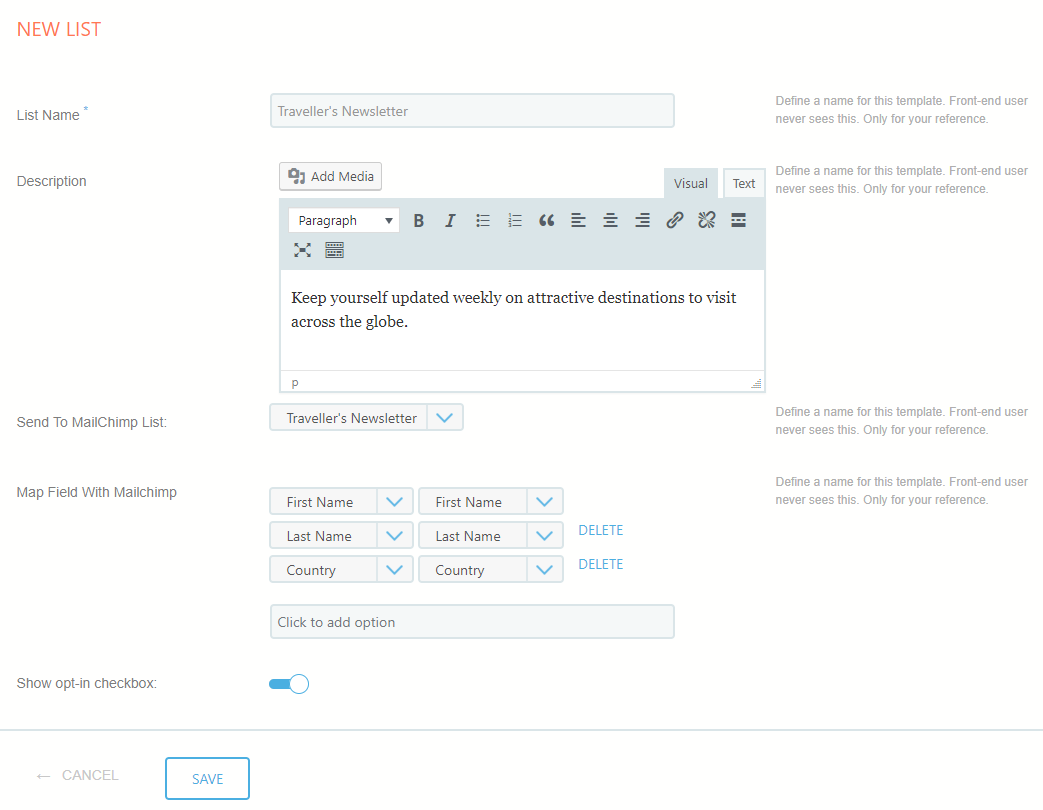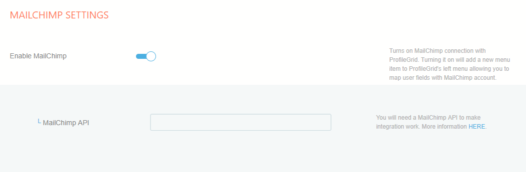 - Subscribing from ProfileGrid will automatically add Users to the selected MailChimp list.