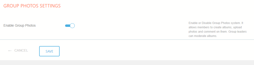 Enable Group Photos. This feature is then added as ‘Group Photos’ to each group on the frontend, allowing members to share photos within their group.