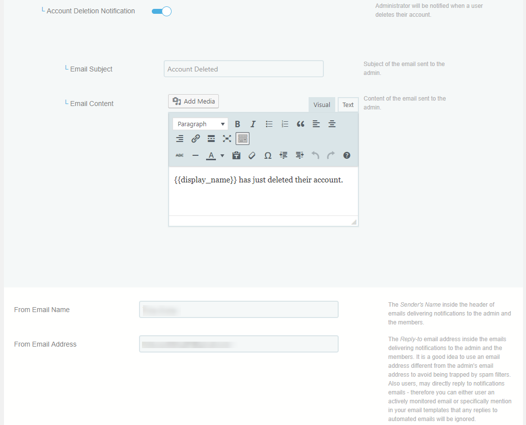 Once you are done entering all the configuration details click the ‘Save’ button. Now on any account deletion on your site, you will receive an email notification.