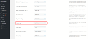 Here you will get various options to work on the appearance and frontend features of the site. In order to display your Profile Page on the frontend, you need to assign the page from here. From the ‘Profile Page’ option select the name of the page that you have assigned as your user profile page. In my case, I will assign the My Profile page here and click on the Save button.