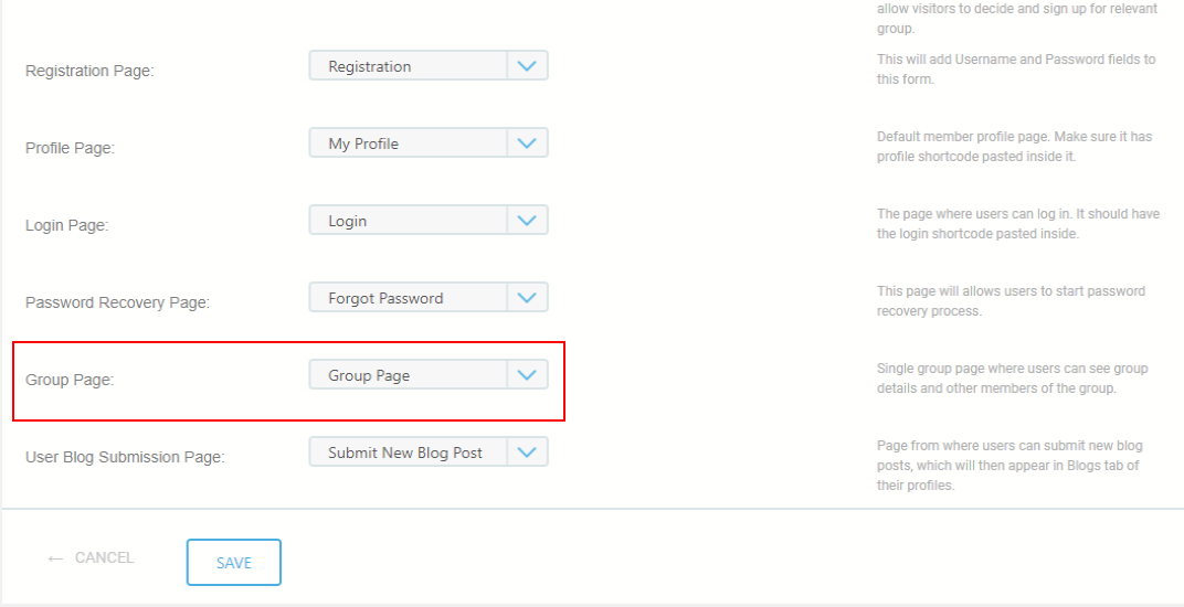 To make the default ProfileGrid pages visible on the frontend, assign them accordingly. Go to the Global Settings menu and click on the General link. You’ll see all the default pages listed there. From the drop-down menu next to Group Page, select the newly created group page, and then click the Save button.