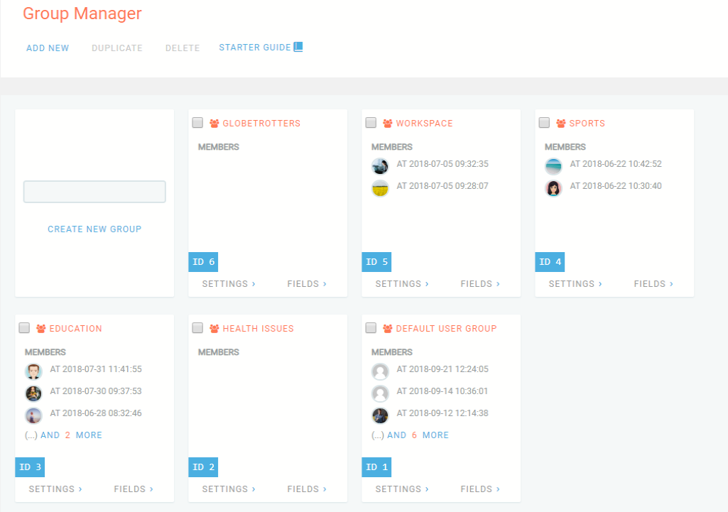 Click on the ProfileGrid menu to access the Group Manager page. Here, click on the “Add New” link in the top left corner to create new groups. These groups will allow you to start adding new users to your site.