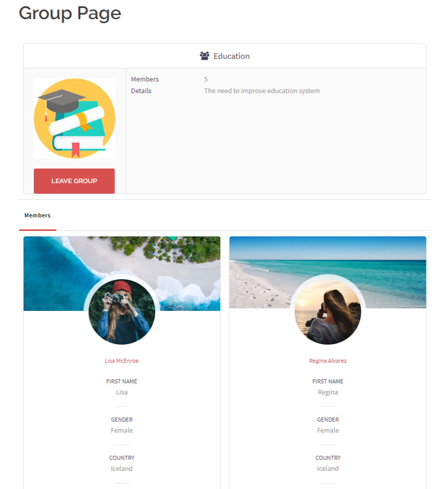 In the example above, you can see a Group Page listing users. By selecting a user, you can view their profile.