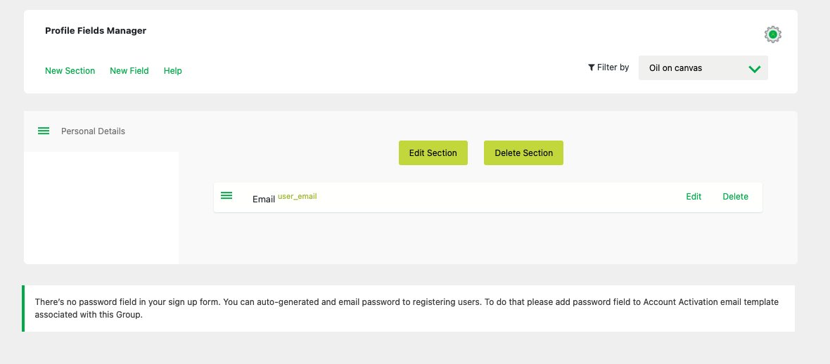 You can add more fields to the group by using the ‘New Field’ link below the ‘Profile Fields Manager’ heading. You can also organize the fields into various sections. New field sections can be created by clicking on the ‘New Section’ link right next to the ‘New Field’ link.