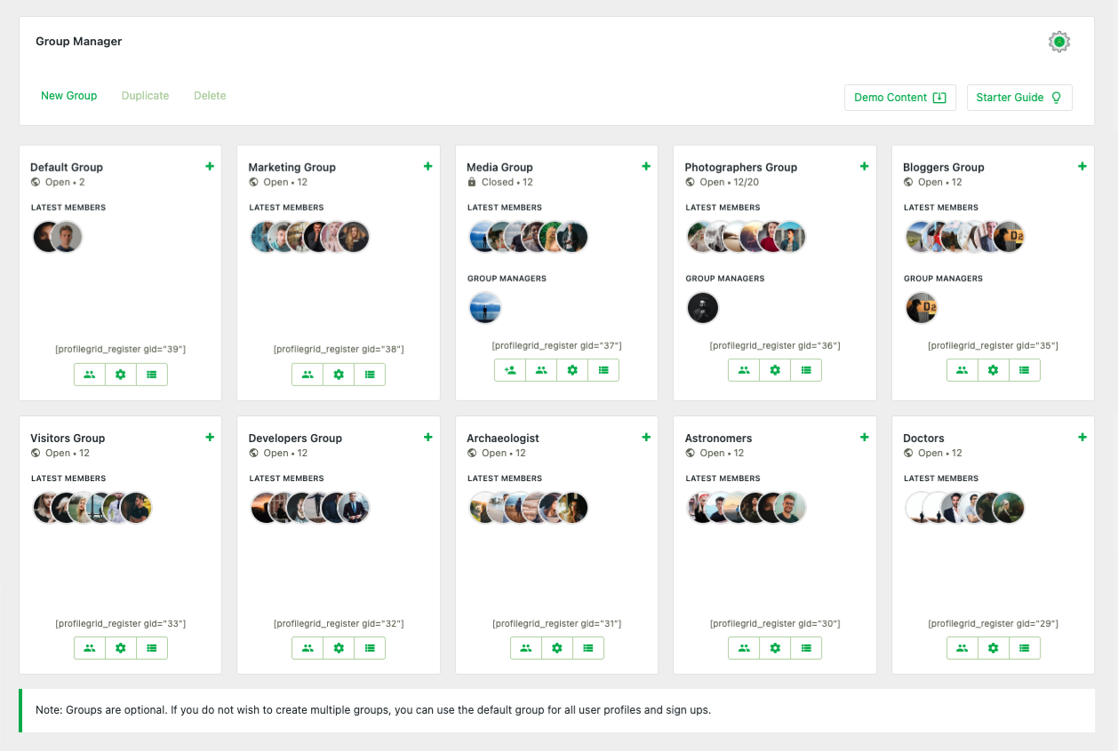 ProfileGrid gives you ten powerful shortcodes right out of the box. Below is a description of them all, along with the shortcode itself: