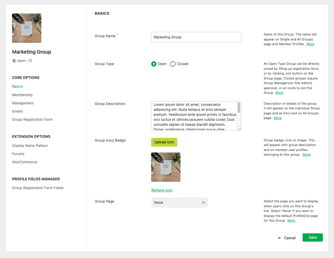 The ‘SETTINGS’ link takes you to the group settings screen where ProfileGrid provides you various options to configure the group’s behavior just the way you want it to.