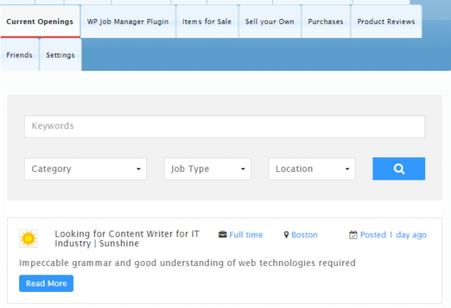 In the above illustration, we see the front end view of user profile ‘User 1’, here you’ll find a ‘Current Openings‘ tab already in place. The visible content of the tab shows the job openings that we created in the backend.