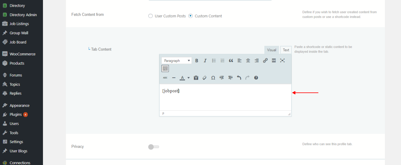 Secondly, since we are going to post job openings on the new tab, we have named the tab ‘Current Openings‘. Now, if we go ahead and start editing the tab we will get two options User Custom Posts and Custom Content. However, we will anyway have to click on the Custom Content option which will then open a text box for pasting the shortcodes.