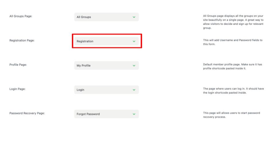 As you can see from the above image we selected the ‘Registration’ page where there is option to assign this particular page. Likewise, on the same page, you can decide the page where user will redirect after completing the registration form or after the user log in. All these pages are created in the same manner we created the registration page. For example, paste the shortcodes [profilegrid_login] or [profilegrid_user_groups_area] on the default pages created by ProfileGrid, publish them and then assign them.
