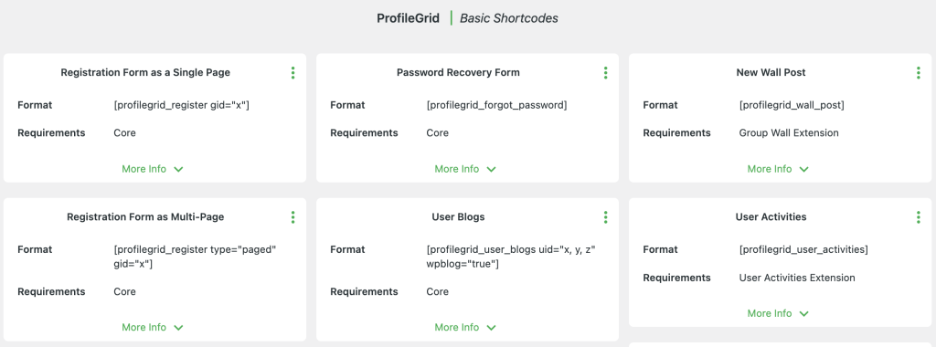 ProfileGrid offers its own set of shortcodes. These cover everything from registration page to login page to setting up geolocation of users on your site. You can publish your community frontend through ProfileGrid shortcodes.